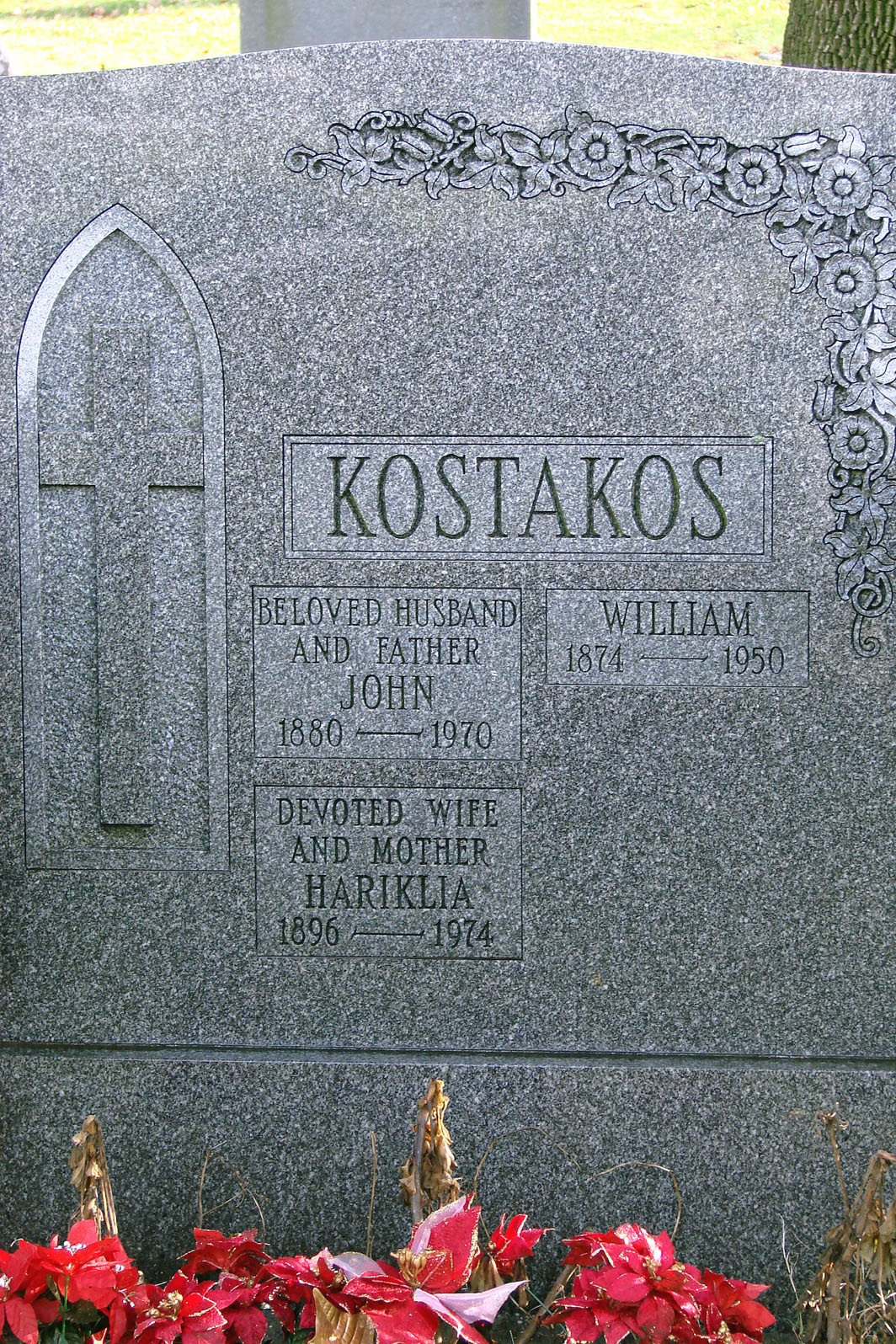 Tombstone Tuesday Posted on January 29, 2013 by Spartan Roots This is the tombstone of my grandparents, John Andrew Kostakos (1879-1970) & Hariklia Aridas Kostakos (1894-1974) and my granduncle William Kostakos (1873-1951). They are buried in Mt. Olivet Cemetery, Queens, New York Share this: Click to email a link to a friend (Opens in new window) Email Click to print (Opens in new window) Print Click to share on Bluesky (Opens in new window) Bluesky Like Loading...