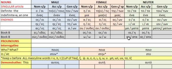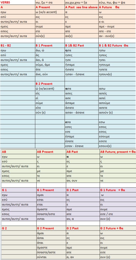 Determined to do better, I have enrolled in private online Greek language lessons. I have doubled up on the lessons, two per week for twenty weeks. Despite many hours of study, I am struggling mightily. The verb tenses are making me tense, and the multiple formats of nouns are confusing and exasperating. After 10 weeks of frustration, I have designed and fine-tuned these color-coded “cheat sheets” for nouns and verbs. Except for those pesky irregulars and exceptions, they work!