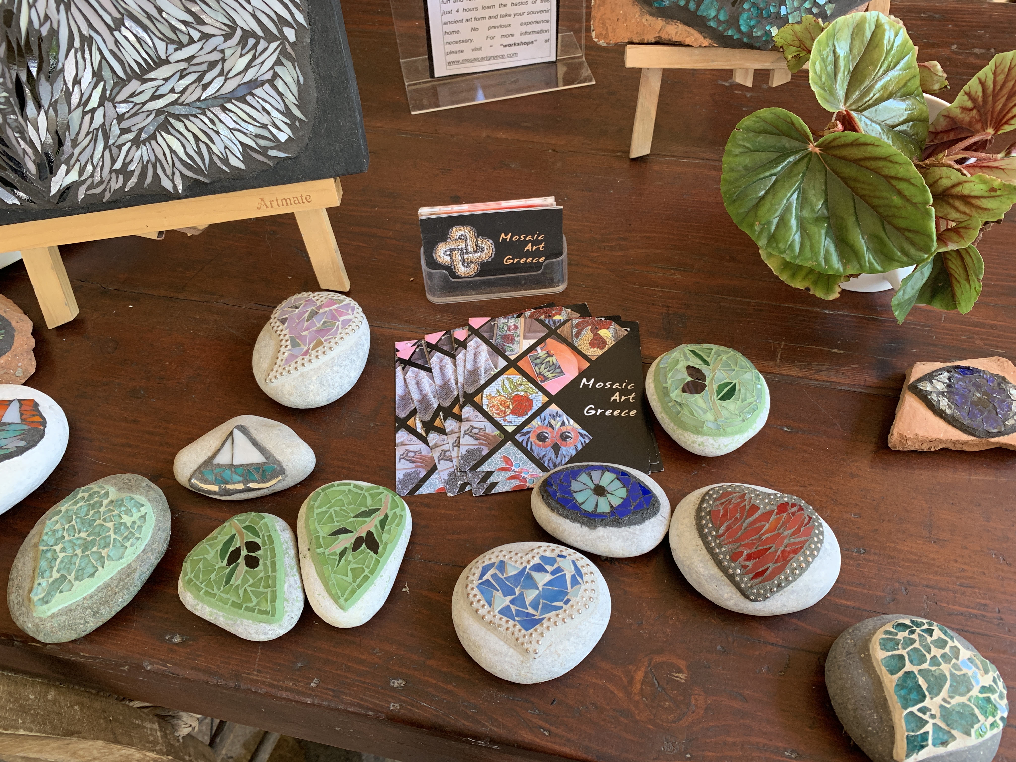 Dimitra works in pebble and glass. She creates designs on rocks, tile, wood, pottery, cloth, and even frying pans. No two pieces are alike. Each takes hours to construct. Pebbles and glass are handpicked and meticulously arranged. This is an art form that combines beauty and functionality; mosaics are found not only as art but on floors, walls and footpaths.