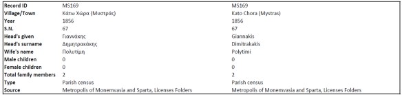 The right hand columns give the record collection name and date. Besides the 1844 and 1871 Voter List, there is an 1856 Parish Census. The first entry is for Giannakis Dimitrakakis, my 3rd great-grandfather and his wife, Politimi!
