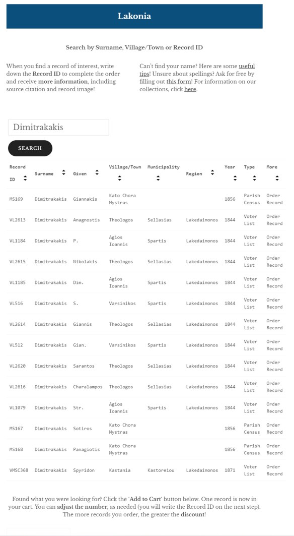 Despite this somewhat daunting scenario of finding and reading records, there is hope! Last month, Gregory Kontos, established a name-searchable website, GreekAncestry.net. His goal is to preserve and make accessible records from Greece. I went to the search page, clicked on Lakonia, and began entering surnames in English. (Searches are bi-lingual and can be done in Greek or English).
