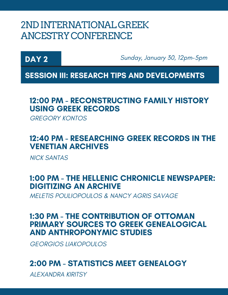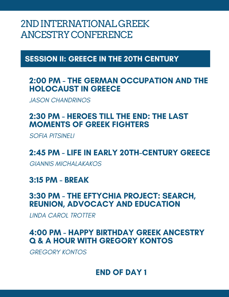 The 2nd International Greek Ancestry Conference will be held on January 29 & 30, 2022 from 12:00-5:00 p.m., EST. This is a FREE and VIRTUAL event. It will be presented live and streamed on Greek Ancestry’s YouTube channel where it will be recorded and available permanently. Registration is not required.