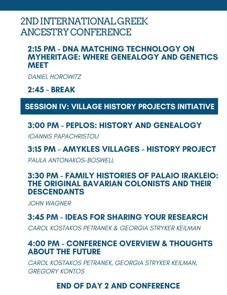 The Conference agenda is below. Additional information can be found here at the Hellenic Genealogy Conference website, where class descriptions and speakers’ bios can be found.