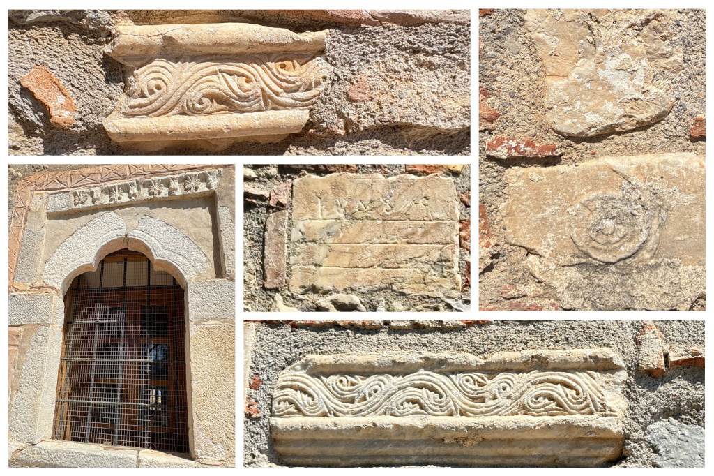 Koimisi tis Theotokou of Agios Ioannis with bell tower (upper left)Note the ancient stones and pillar fragments that were incorporated into the exterior stonework of the church. The small frieze over the window was carefully placed to accentuate its opening.