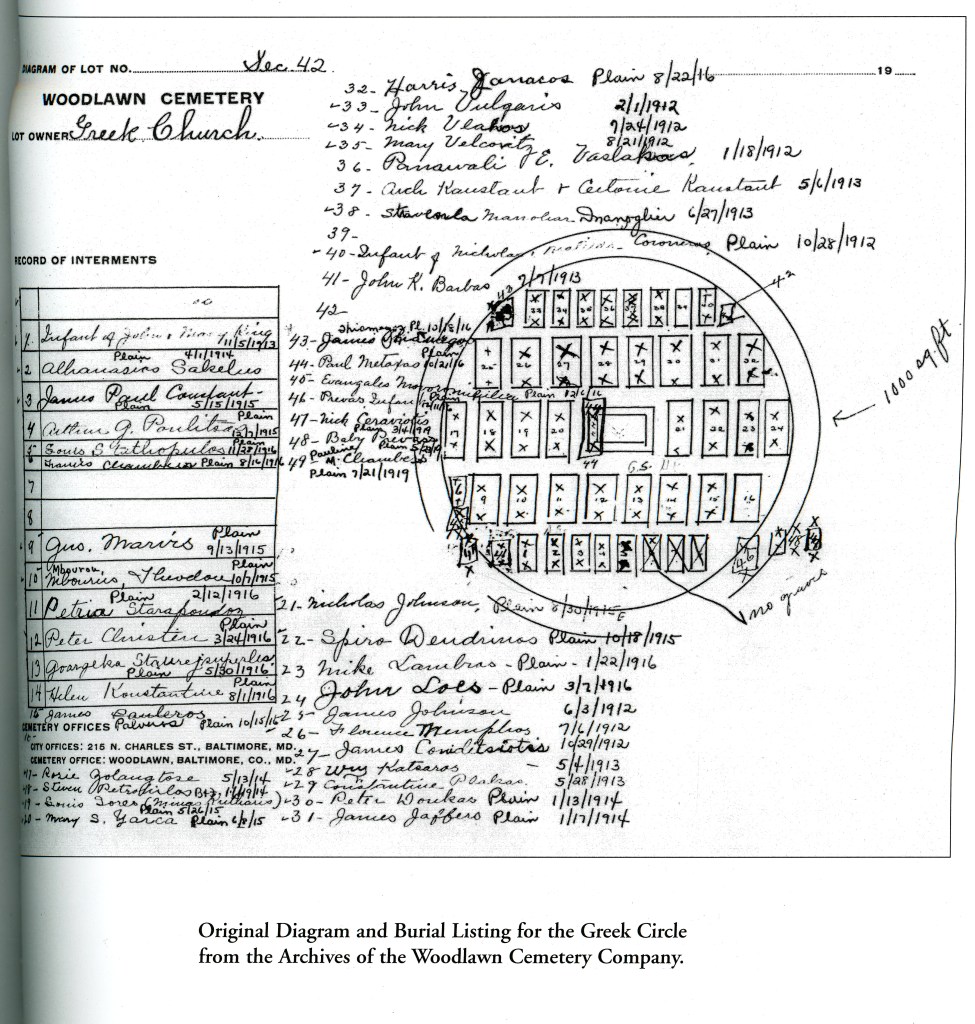 On a clear and lovely day this June, Nicholas Prevas took me to the sacred and historic resting place of the earliest Greek immigrants in Baltimore, Maryland. We were welcomed by flocks of geese as we drove the gently winding road past a rippling lake to the “Greek Circle,” situated at the pinnacle of Woodlawn Cemetery. So named because the 1,000 square foot parcel of land is in the shape of a circle, this hallowed ground holds the stories of families who left their rural villages and thrived in the teeming city of Baltimore in the early 1900s.