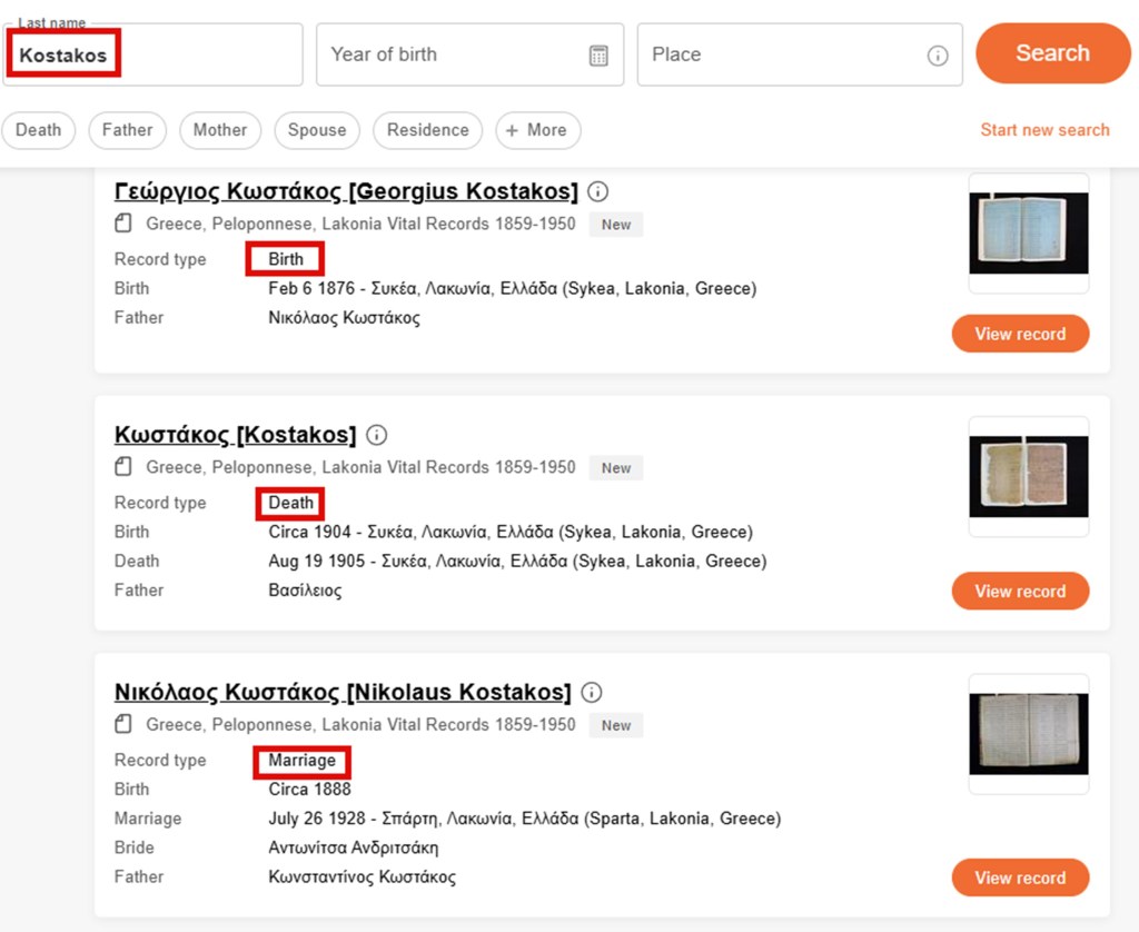 The collection can be searched by name in either Greek or English. In the example below, I typed in English only the surname Kostakos without designating a village or type of record. Birth, marriage and death records for the surname Kostakos in any village are given.