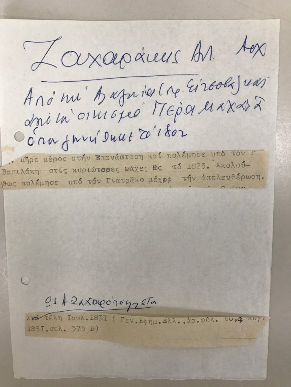 The Archives in Kalamata has a one-of-a-kind collection created by Μίμη Iλ. Φερέτος (Dimitris or Mimi Il. Feretos). Giannis Michalakakos described Mr. Feretos as a journalist and writer who gathered information on fighters of the 1821 Revolution. In the early 1900’s, he interviewed people who had fought (or whose relatives fought) in the War of Independence. Mr. Feretos created a surname index which include brief notes and reference sources to find the original documentation. The GAK in Kalamata has a bookcase filled with Mr. Feretos’ notebooks. They are arranged in alphabetical order, and Giota easily found the Eftaxias and Zaharakis surnames.