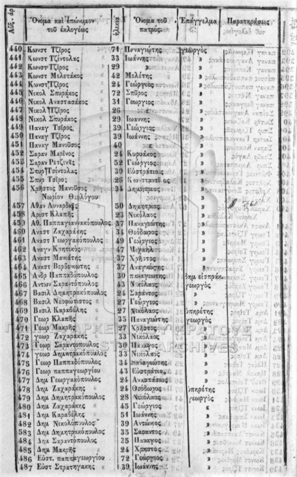Another twist: the Election Lists of 1875 show a Michalis Eftaxias who was born around 1800, fought in the Revolution, and lived in Lagia. That is 117 km from Kalamata, a 39-hour walk! Is it possible these two families are related? Not impossible, but perhaps improbable. This could be an example of the second bullet–someone working in a church, taking the ευταξη title as a surname.