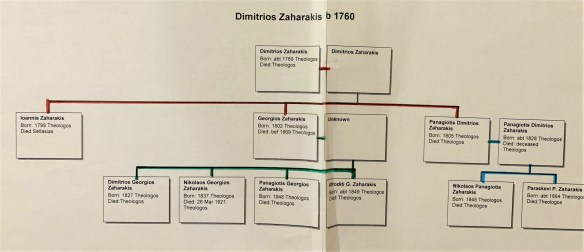 This document reveals two important things: first, M. Zaharakis is not my family; he was born in a region far from Theologos at a time when my Zaharakis are found in documents in Theologos. Second, M. Zaharakis was also known as Zaharopoulos. This is a critical piece of information because there is a long-standing (and frustrating!) pattern of Greeks changing their names. Having written proof that Zaharakis and Zaharopoulos in Kalamata are the same family, saves years and tears for the serious researcher.