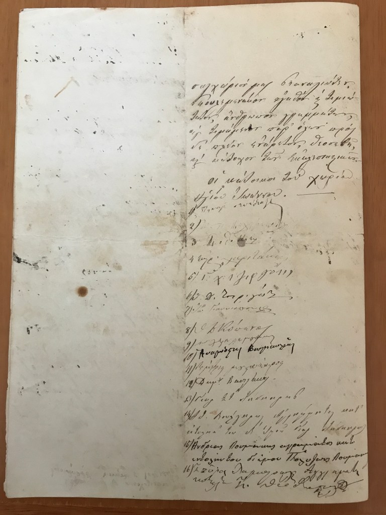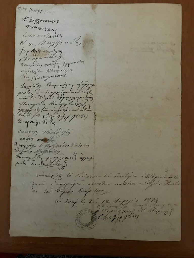 When I was digitizing marriage documents at the Metropolis of Sparta, I came across one that caught my attention because it did not appear to be wedding-related. It was a letter with three pages of signatures. I was able to read the words Αγιός Ιωάννης (St. Johns) which caused me to stop work immediately. This is my village and my curiosity was raised–what is this document? My colleague, Gregory Kontos, explained that it was a petition from the residents of Agios Ioannis to the Bishop, requesting that a second priest be appointed. There were over 200 families in the village and the villagers felt that having just one priest was not sufficient to meet the needs of the people. They proposed that a local man, Panagiotis Poulimenakos, be ordained.