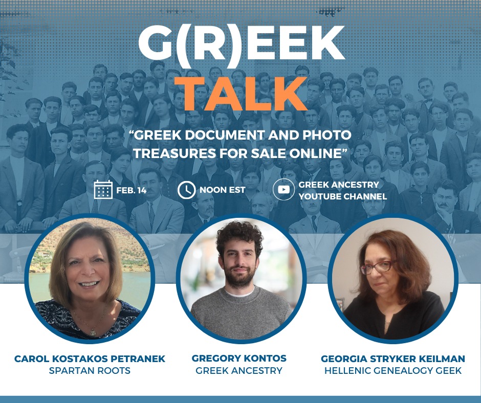 G(r)eek Talk will be hosted by Gregory Kontos and cohosted by Georgia Stryker Keilman of the Hellenic Genealogy Geek website and Facebook group, and Carol Kostakos Petranek of the Spartan Roots website. Each episode will kick off with updates in the field, then move on to spotlight a specific theme. The group will dive into topics ranging from tracing ancestral roots to delving into less known aspects of Greek history and archival heritage. Guest speakers will bring viewers a wealth of varied perspectives and insights, expanding their knowledge and broadening their understanding of the lives and times of their ancestors.