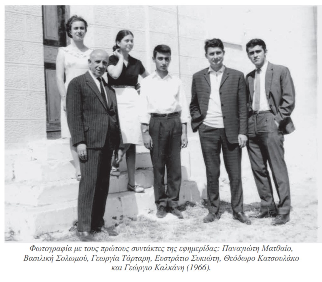 The founding editors, from the 50th anniversary issue of The Faris, April 1996: left-right: Panagiotis Mathaio, Vasiliki Solomou, Georgia Tartari, Efstratios Sykiotis, Theodoros Katsoulakos, and Georgios Kalkanis